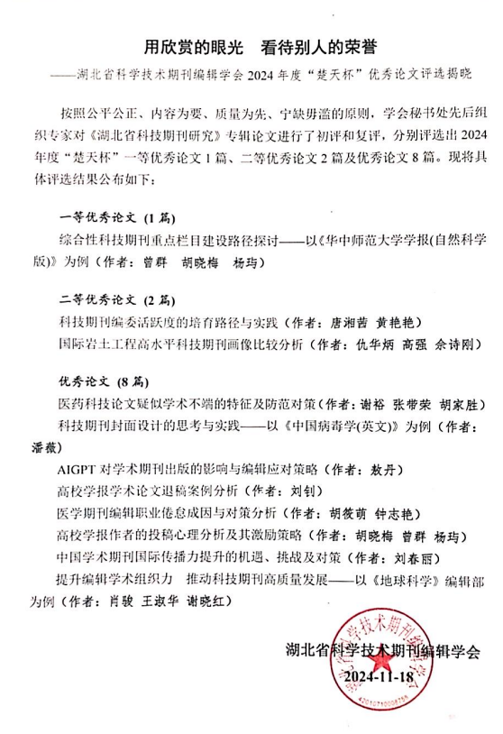 ——湖北省科學(xué)技術(shù)期刊編輯學(xué)會(huì)2024年度“楚天杯”優(yōu)秀論文評(píng)選揭曉